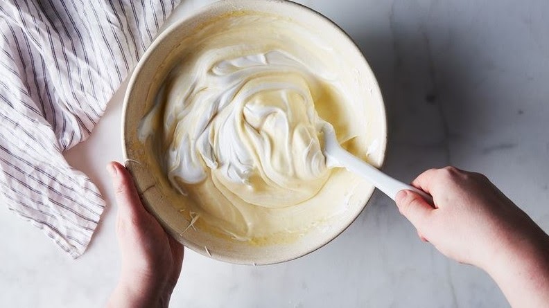 Đầu tiên, bạn sẽ cho khoảng 1/3 hỗn hợp lòng trắng trứng đã đánh bông vào tô hỗn hợp bột lòng đỏ lúc nãy và dùng phới lồng trộn đều tay đến khi hỗn hợp hòa quyện hoàn toàn.