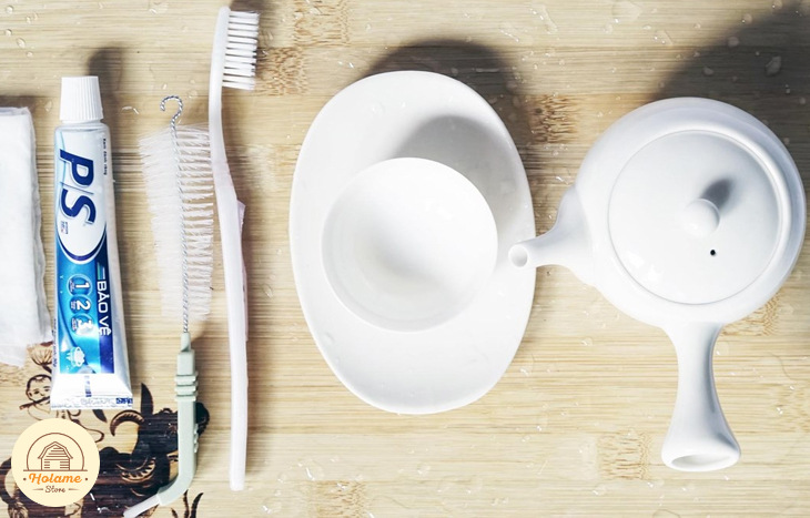 – Sử dụng kem đánh răng: Ngâm những đồ gốm sứ bẩn này vào trong nước ấm trong 5 phút. Tiếp đó ta dùng bàn chải đánh răng với kem đánh răng chà lên vết bẩn đó và làm sạch lại bằng nước ấm một lần nữa. Kem đánh răng có công dụng sẽ làm sạch mọi vết ố vàng, vết bẩn trên các vật dụng gốm sứ nhà bạn mà không cần tốn quá nhiều công sức cho việc vệ sinh.