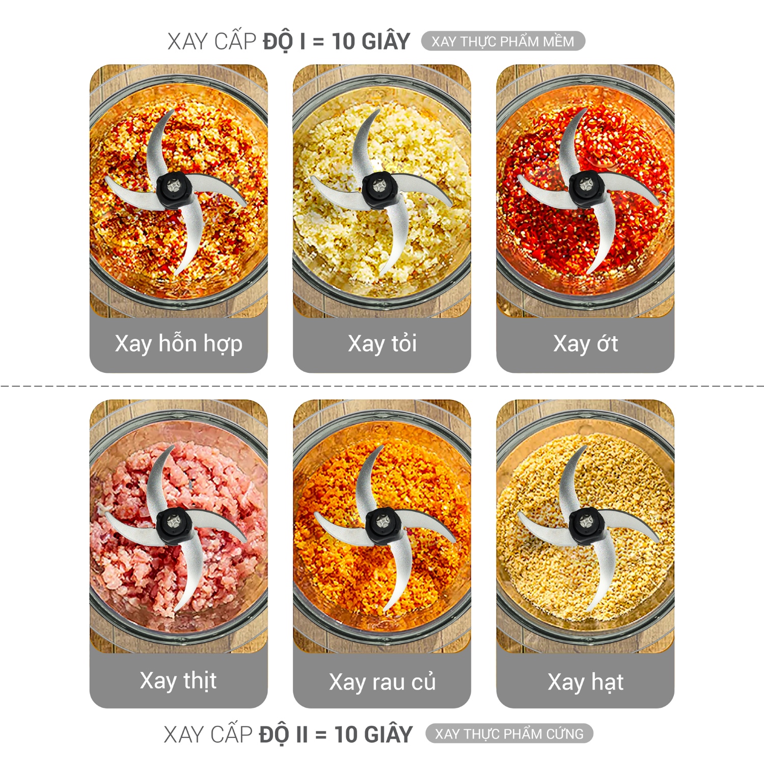 Cách xay: Mỗi lần xay từ 300g-500g (đối với thịt) các thực phẩm khác nên căn 1/2 cối. Sau đó, hãy giữ máy 15s và sau đó thả 5s (để máy nghỉ) - tiếp tục chu kỳ giữ 15s và thả 5s làm như thế sẽ giúp cho thịt xay được nhuyễn và đều tránh giữ quá lâu gây áp lực, máy sẽ nóng.
