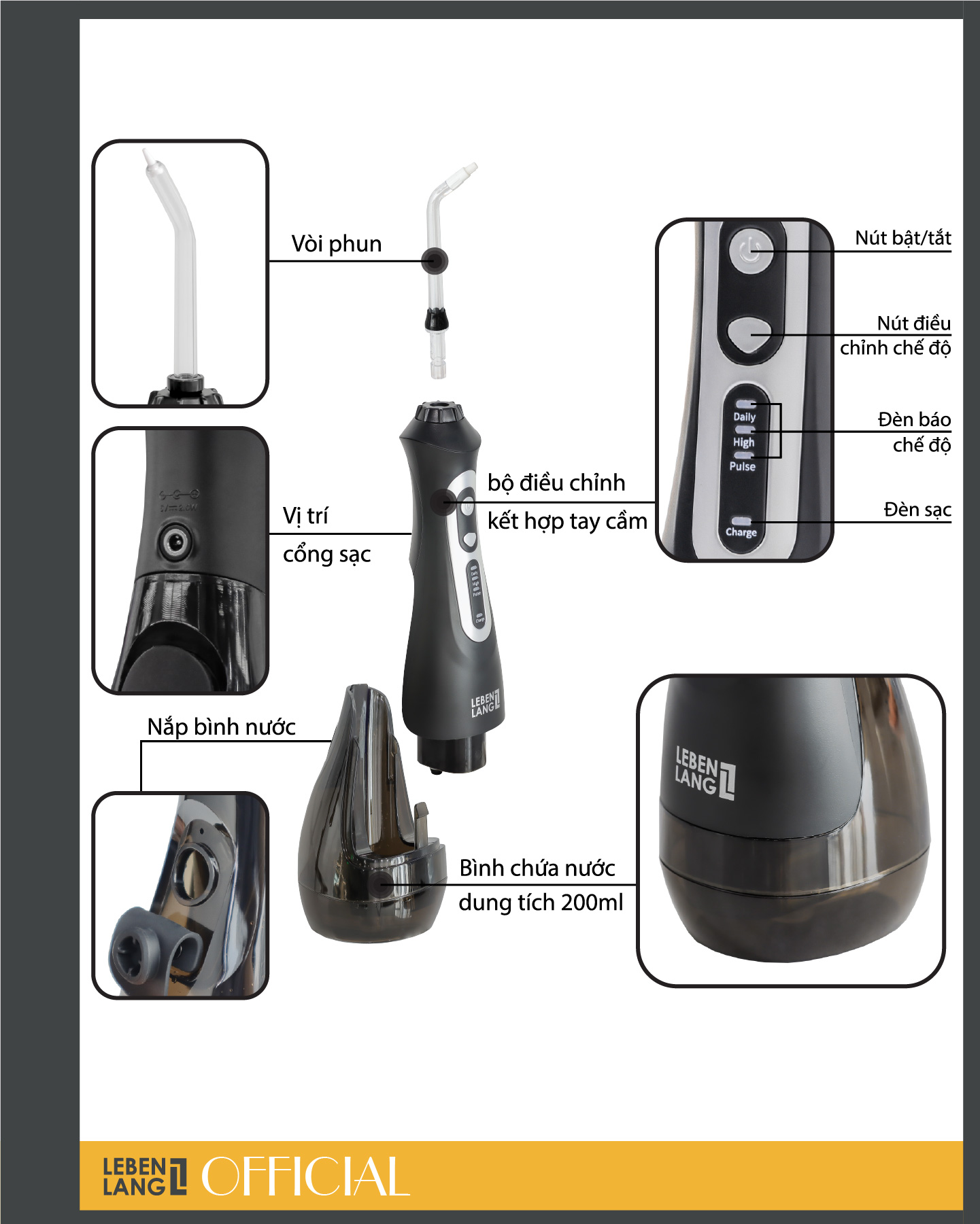 | Phụ kiện | Cáp sạc USB, 5 vòi phun, túi cầm tay, hộp đựng vòi phun. |
